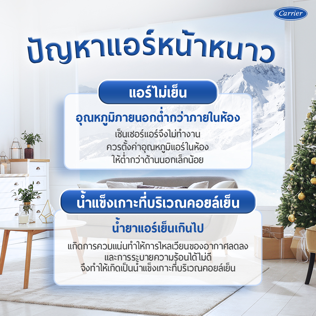 หน้าหนาวใกล้เข้ามาแล้ว หลายคนก็คงจะชื่นชอบอากาศที่เย็นสบาย แต่ใครหลายคนเพียงแค่ลมหนาวเย็นอาจไม่พอ ยังคงต้องพึ่งพาแอร์เพื่อความเย็นสบายได้ตลอดทั้งปี แต่หากพูดถึงปัญหาที่พบเจอในฤดูหนาวที่มีสาเหตุหลักจากสภาพอากาศที่เปลี่ยนแปลงไปก็คงมีไม่น้อยเช่นกัน จะมีปัญหาอะไรบ้าง และต้องแก้ไขหรือป้องกันเบื้องต้นได้อย่างไร แคเรียร์มีคำตอบมาให้กัน